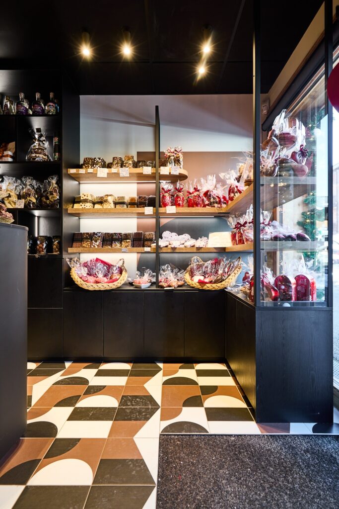 Derrière la banque, un jeu de vitrages sérigraphiés apporte une touche graphique, reprenant les textures et aspérités du chocolat sous différentes formes, tandis que l’éclairage, pensé avec minutie, souligne cette ambiance feutrée.