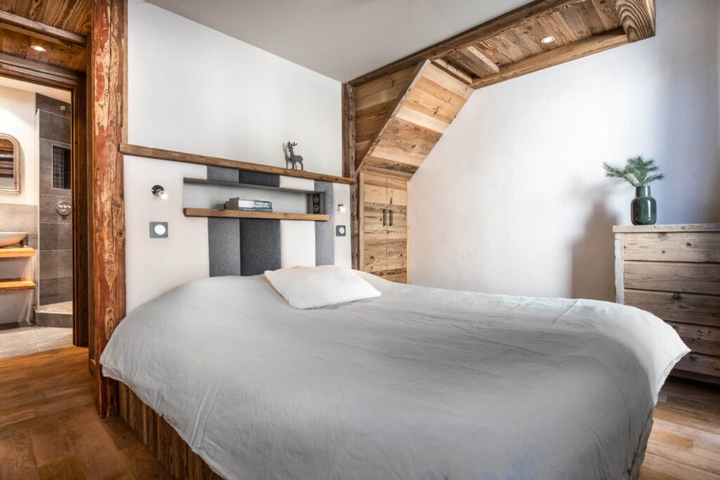 Après plusieurs recherches, l’option retenue pour la liaison de cet appartement à Val d’Isère, a consisté à créer, dans ce nouvel espace, une suite parentale avec salle de bain, et de nombreux rangements.