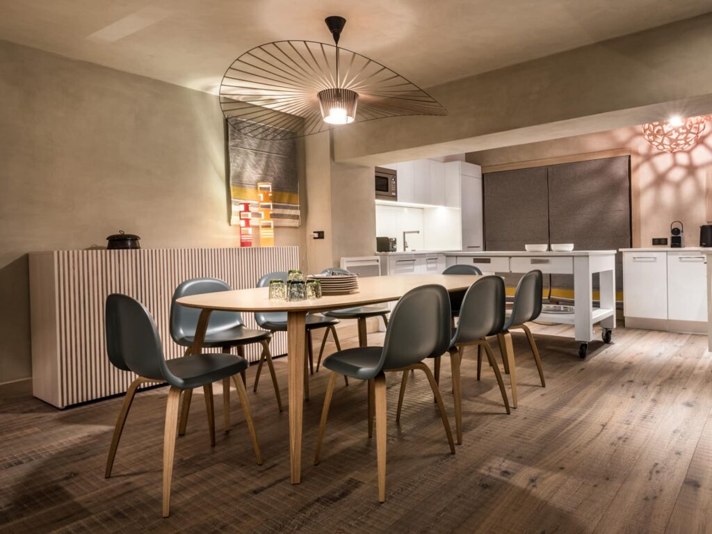 L’organisation des volumes, la fluidité de l’espace, et l’utilisation de tonalités douces confèrent une grande sérénité à l’ambiance générale de ce chalet. Cette harmonie est aussi habilement relevée par quelques touches plus design. Deux fauteuils Hay aux couleurs acidulés apportent de la luminosité et de la gaîté. Un canapé en plumes aux lignes arrondies et modernes invite à passer de confortables moments au coin du feu… Une suspension « Petite friture » suscite la poésie au-dessus d’une table repas conviviale, de style scandinave. Un lampadaire s’inspirant du designer Serge Mouille apporte un clin d’œil rétro. La décoration de ce chalet a aussi été personnalisée par les propriétaires : des objets d’origine tibétaine s’inscrivent parfaitement dans une décoration de montagne et invitent à un peu de spiritualité. Enfin baies vitrées et fenêtres sont « habillées » de tissu Arpin, en pure laine vierge de Savoie, offrant des « couleurs douces et naturelles au toucher pour un bien-être relaxant ».