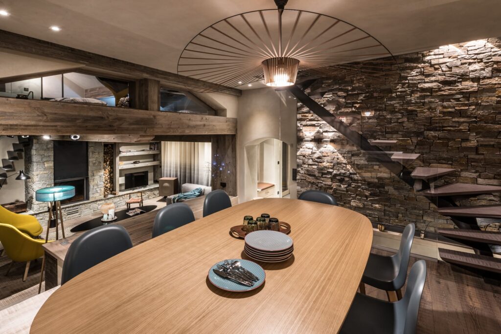 Désormais ce chalet s’inscrit dans un style contemporain, tout en présentant des matériaux traditionnels et nobles : le bois, la pierre, le métal et le verre, qui répondent parfaitement aux nouveaux codes de la décoration en montagne.