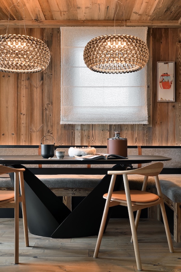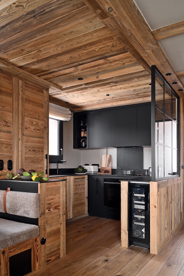 Le parti pris esthétique développe une montagne contemporaine : un lieu chaleureux mais très actuel, construit autour de matières nobles : vieux bois, parquet, enduits à la chaux, matériaux naturels, associées à des lignes sobres et à des éléments en verre, notamment une verrière type atelier qui filtre la cuisine depuis le séjour tout en conservant la transparence.