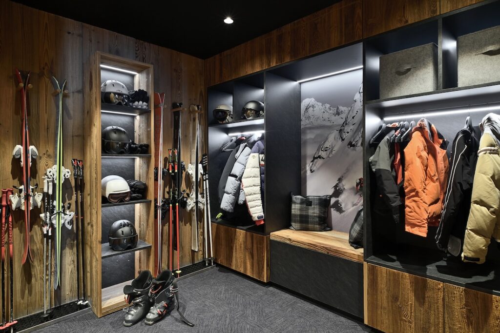 L’étage inférieur est l’accès le plus utilisé par les propriétaires, directement depuis les garages de la résidence. On y trouve d’abord un ski room, pensé dans un esprit « boutique », avec de grands tiroirs. Conçu comme un espace très fonctionnel, il dissimule une zone buanderie.